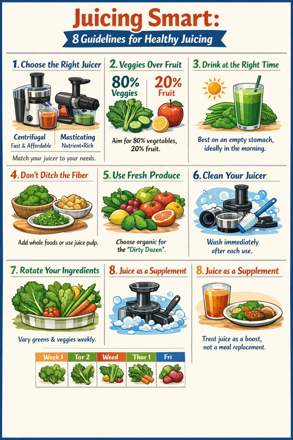 Se você quiser uma resposta direta: o suco funciona melhor quando complementa uma dieta balanceada, em vez de substituir alimentos integrais. O espremedor certo, os ingredientes certos e alguns hábitos inteligentes fazem a diferença entre uma rotina genuinamente saudável e uma que o carrega silenciosamente de açúcar. As 8 diretrizes abaixo eliminam o ruído e fornecem uma estrutura prática que você pode realmente seguir.
