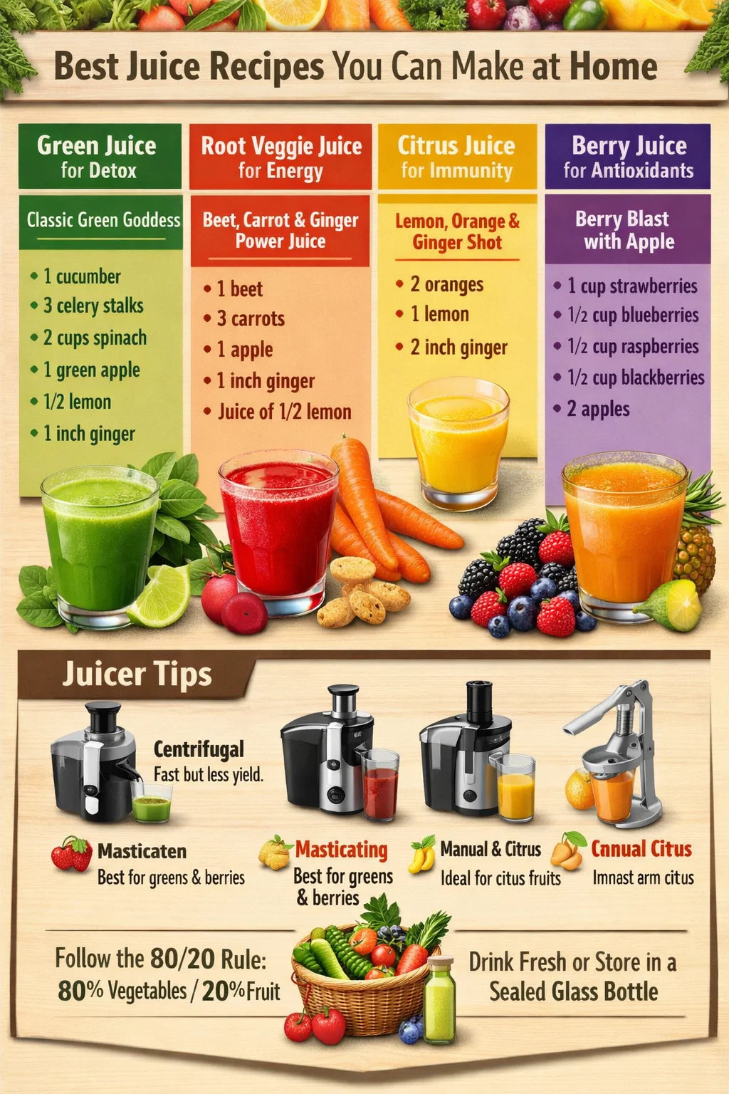 O melhor diferente suco receitas combinam vegetais e frutas de uma forma aproximadamente Proporção de 80% de vegetais para 20% de frutas , fornecendo o máximo de nutrientes sem excesso de açúcar. Quer você use um espremedor centrífugo ou um espremedor mastigador prensado a frio, as categorias principais são as mesmas: sucos verdes, misturas de raízes e vegetais, misturas cítricas, bebidas à base de frutas vermelhas e combinações tropicais. Cada categoria serve a um propósito nutricional diferente e, depois de entender o padrão, criar suas próprias receitas do zero torna-se simples. As seções abaixo abordam todos os principais tipos, com quantidades exatas de ingredientes, dados de saúde e dicas práticas que funcionam independentemente do espremedor que você possui.