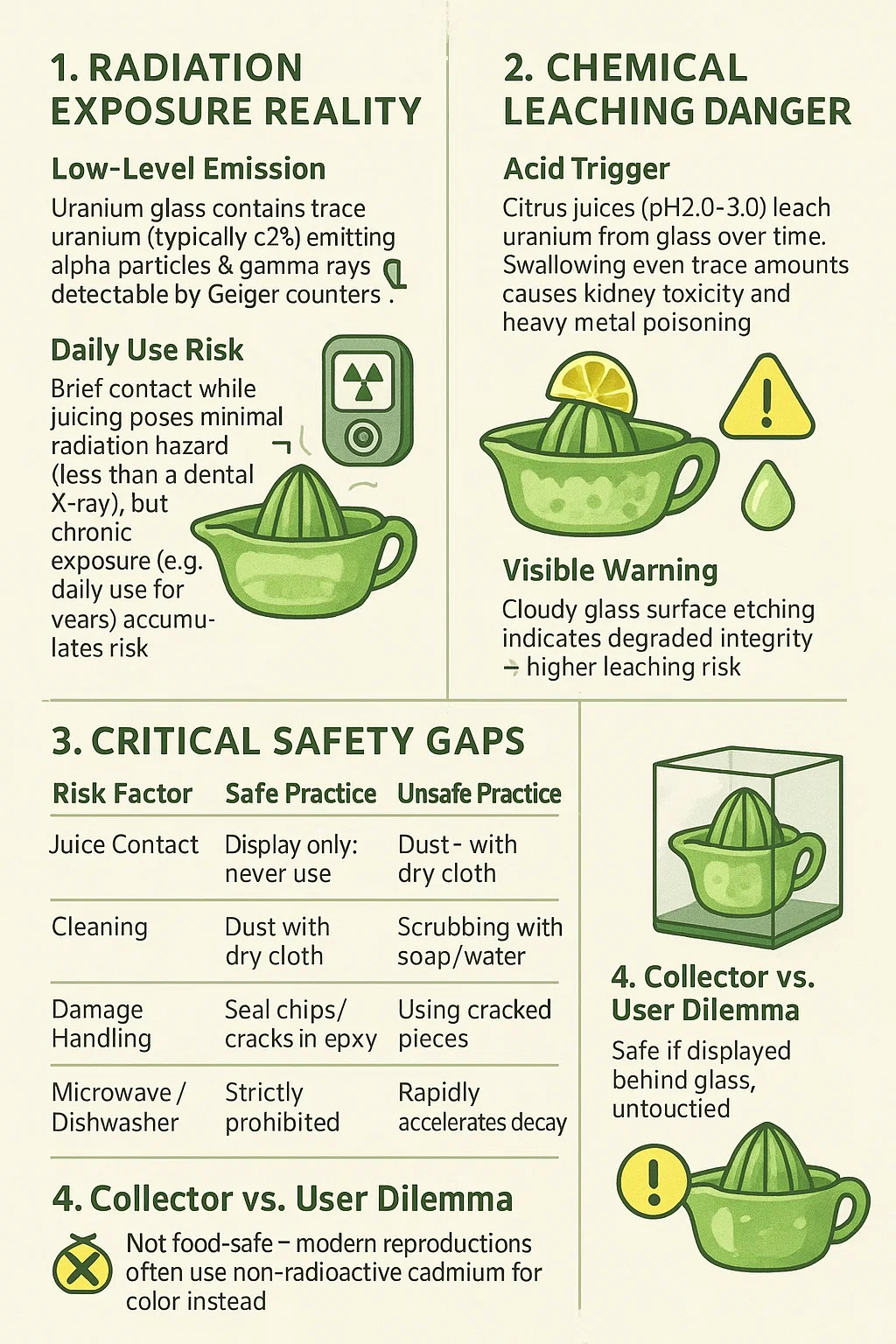 Gatilho ácido: sucos cítricos (pH 2,0–3,0) lixiviam o urânio do vidro ao longo do tempo. Engolir até mesmo pequenas quantidades causa toxicidade renal e envenenamento por metais pesados.